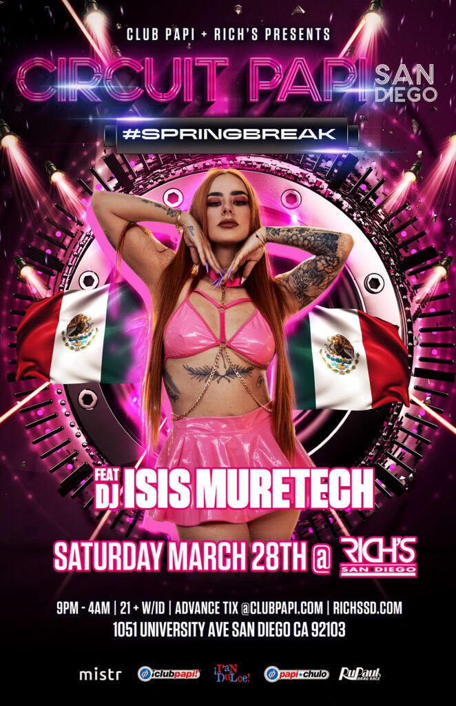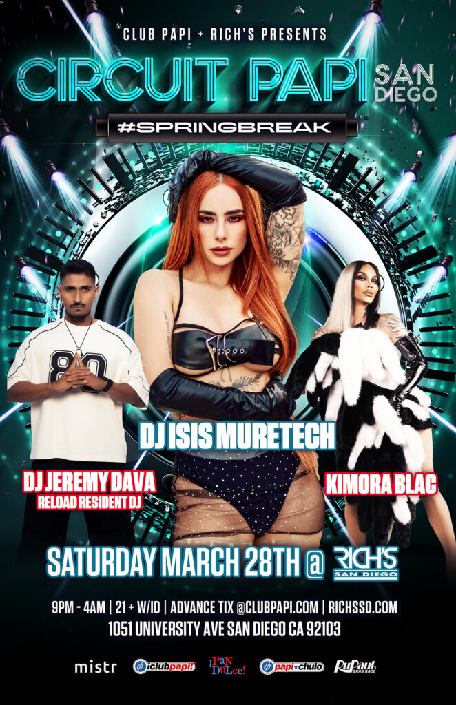 Club Papi & Richs Nightclub present CIRCUIT PAPI #Springbreak with Superstar Lady DJ/Producer ISIS MURETECH + Reload Resident DJ JEREMY DAVA & DJ Sebastian (Tijuana) in the Main Room spinning Latin Mixes | Tribal | Vocal Anthems | Mashups on Saturday, March 28th in the heart of Hillcrest @ RICHS NIGHTCLUB!! 12 Gorgeous PAPI #Trophyboy Go-Go Dancers with Rupaul Drag Race Star SALINA ESTITIES Performing Live & Hosted by RPDR Queen KIMORA BLAC! America’s BIGGEST Latin & Circuit Themed Dance Party with 2 Caliente rooms of Music!
